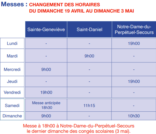 - Jeudi : 9h à Sainte-Geneviève et 19h à Notre-Dame du Perpétuel Secours