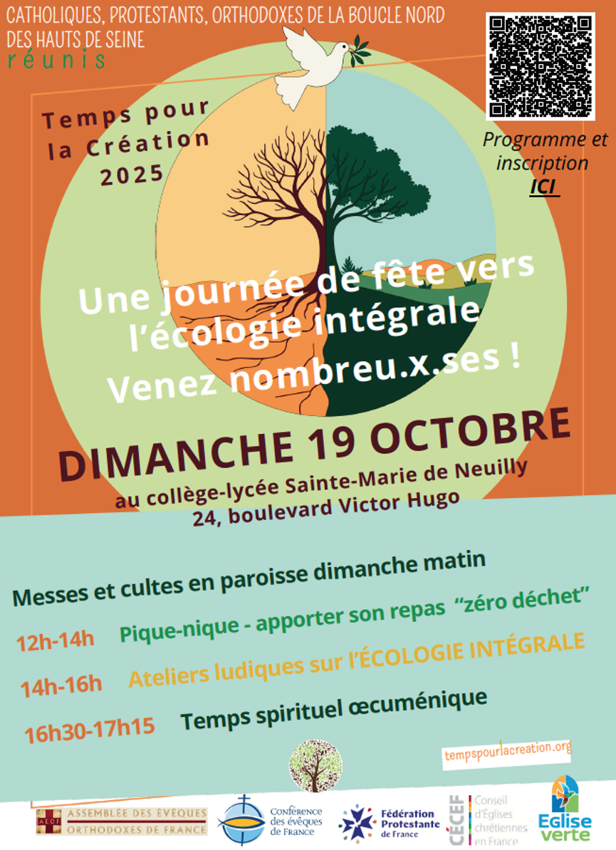 Participer à la fête de la Création organisée le dimanche 19 octobre prochain par le groupe Laudato Si Église Verte de la paroisse avec plusieurs communautés chrétiennes Église Verte de la boucle Nord des Hauts-de-Seine, au collège-lycée Ste Marie de Neuilly. Au programme : pique-nique zéro déchet, jeux, activités créatives, projection d’un documentaire, et temps de prière œcuménique pour clore la journée. Toutes les informations pour s’inscrire seront disponibles à partir de la semaine prochaine.