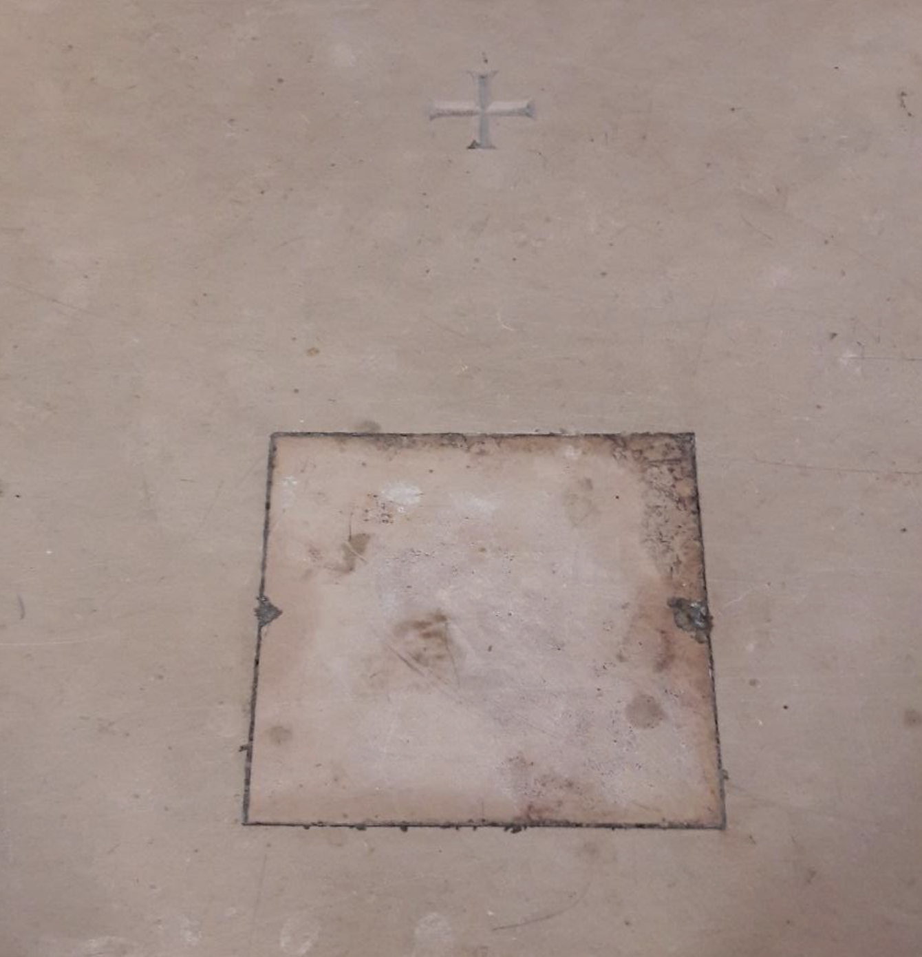 Devant l’autel, dans un petit carré de marbre se trouve “une boîte en argent de forme carrée soigneusement fermée munie d’une vitre et entourée d’un ruban de soie rouge” marquée du Sceau du Cardinal Verdier.