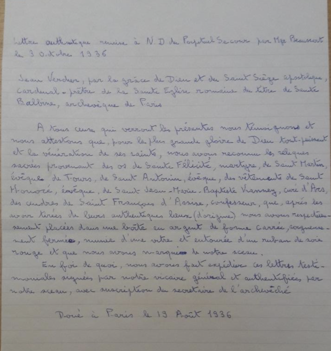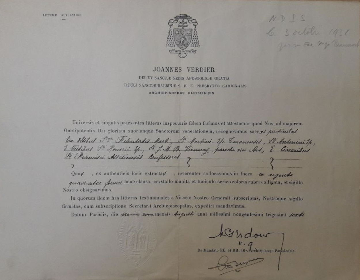 A l’intérieur de cette boîte sont déposées les reliques de plusieurs Saints : les os de Sainte Félicité martyre, Saint-Martin évêque de Tours, Saint Antonin, évêque, et des vêtements de Saint-Honoré évêque, de Saint Jean-Marie Vianney, curé d’Ars, des cendres de Saint-François d’Assise, confesseur comme l’atteste le Cardinal Verdier lui-même.