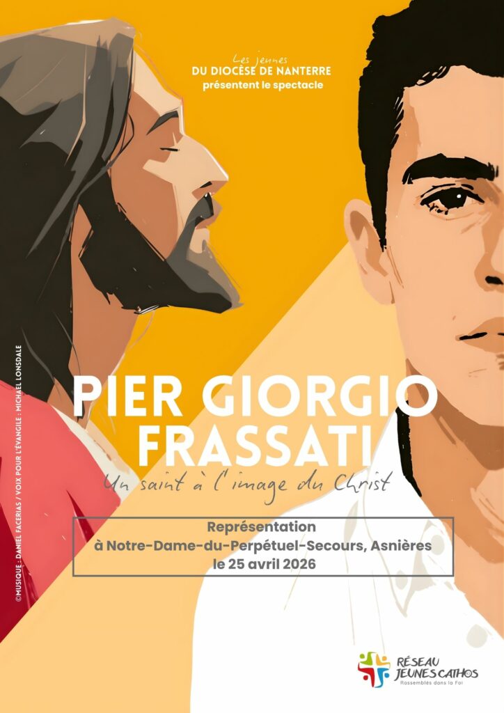 Pier Gorgio Frassati a été canonisé le 7 septembre 2025 par le Pape Léon XIV. Un spectacle écrit par la pastorale des jeunes du diocèse de Nanterre et les Baladins de l’Évangile se jouera à Notre-Dame-du-Perpétuel-Secours le samedi 25 avril 2026 à partir de 20h00 (durée 1h45). Cette pièce met en écho la vie passionnée de Pier Giorgio Frassati et la Passion du Christ.